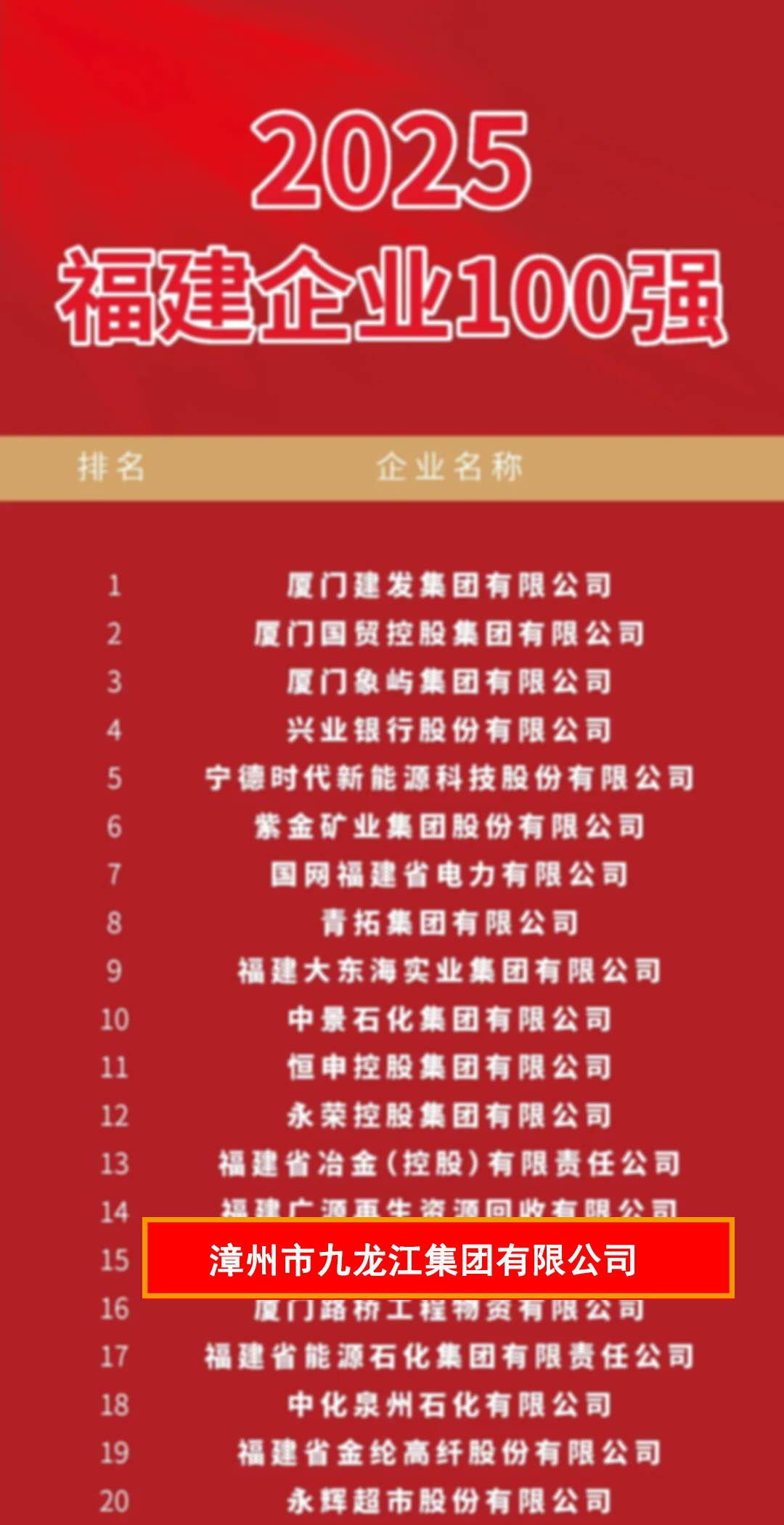 “2025福建企业100强”榜单