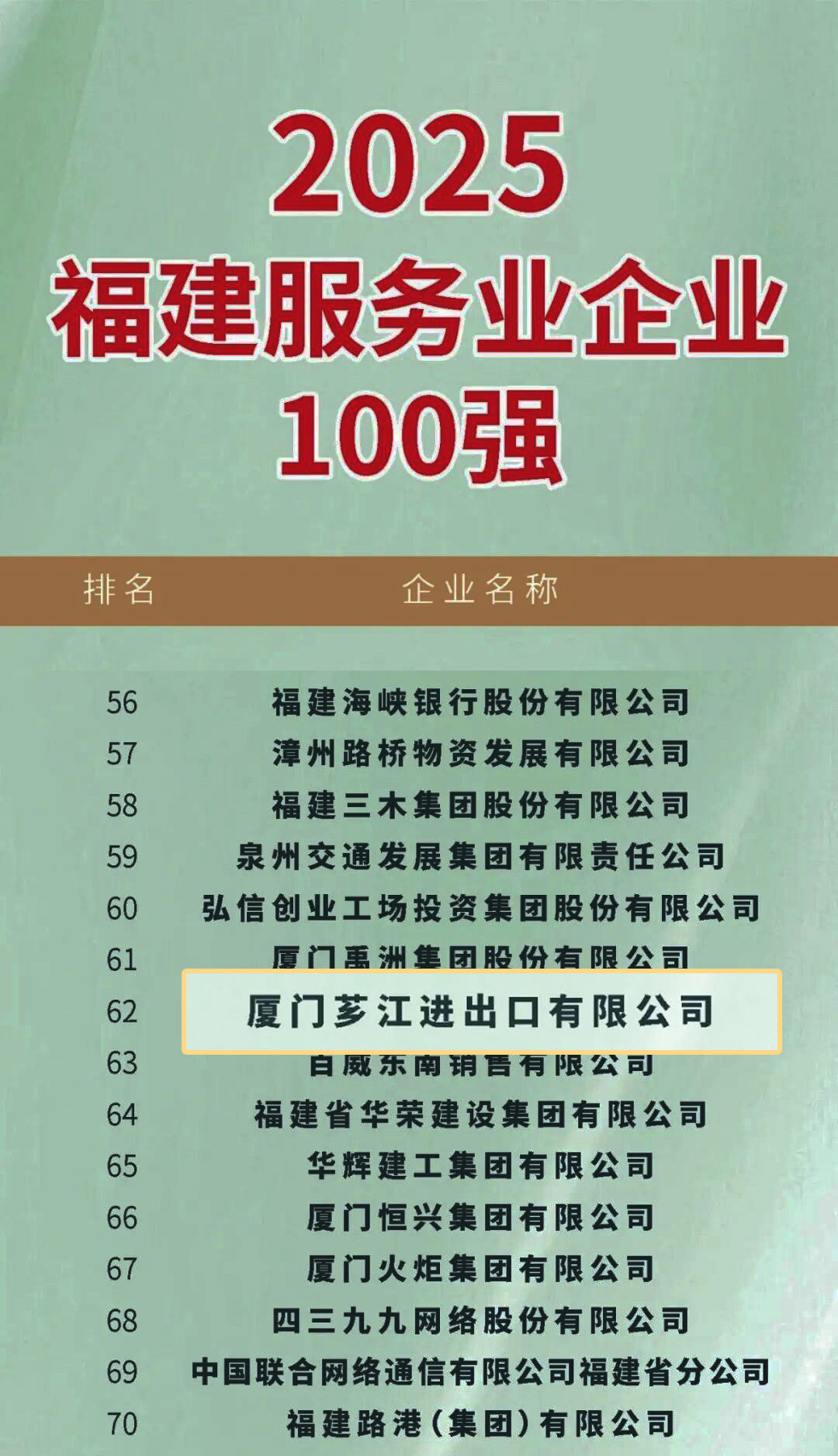 “2025福建服务业企业100强”榜单