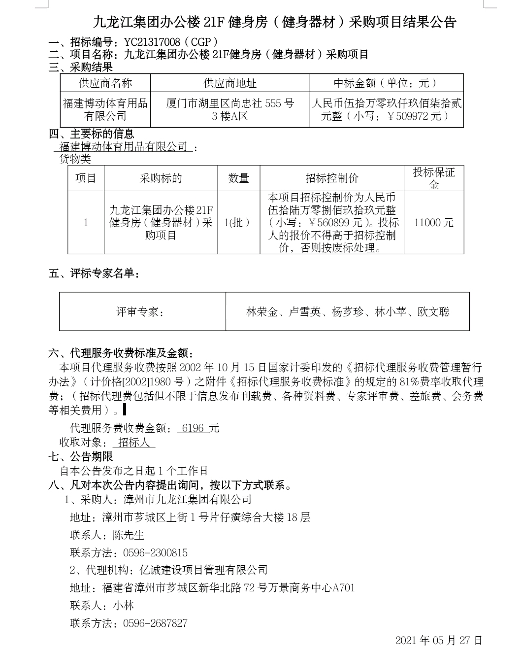 太阳成集团tyc234cc集团办公楼21F健身房(健身器材)采购项目结果公告