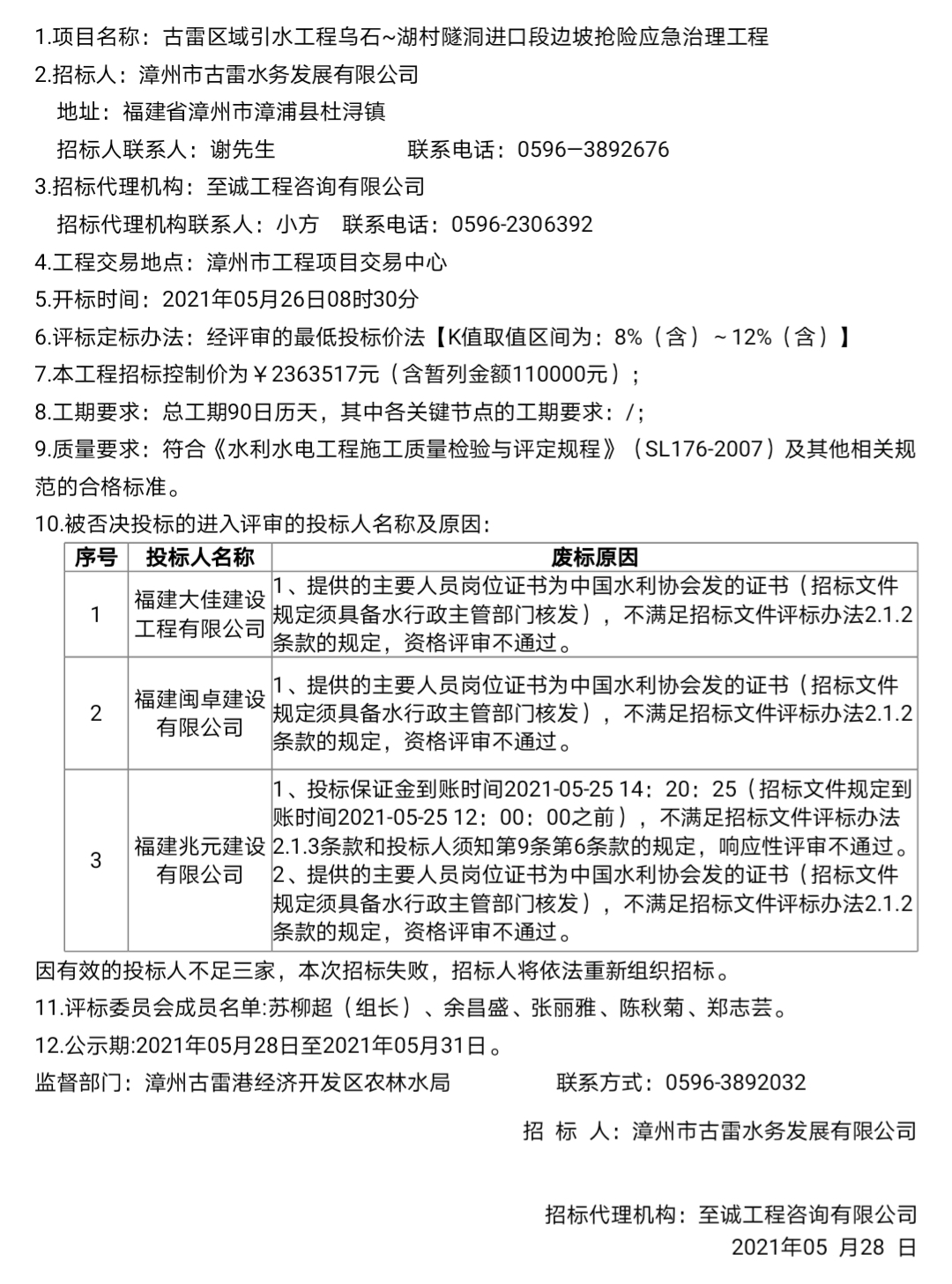 古雷区域引水工程乌石~湖村隧洞进口段边坡抢险应急治理工程流标公示